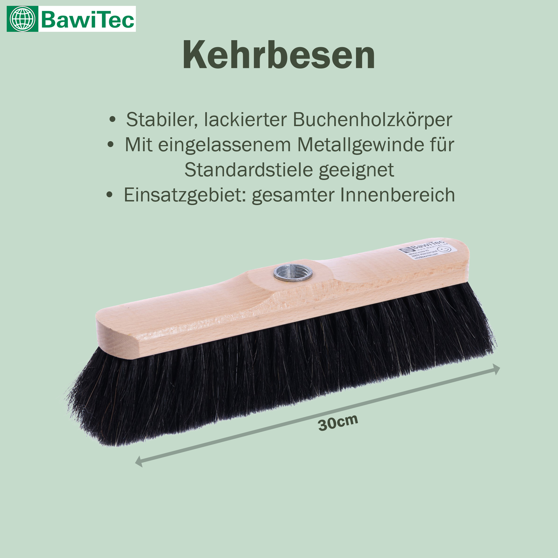 Hochwertiger Rosshaarbesen für anspruchsvolle Reinigungsaufgaben im Innenbereich. Die feinen, weichen Naturhaarborsten erfassen mühelos feinen Schmutz und Staub, ohne empfindliche Oberflächen zu beschädigen. Der stabile, lackierte Buchenholzkörper (30 cm Breite) mit eingelassenem Metallgewinde passt auf alle Standardstiele. Ideal für Haushalt, Küche, Büro und Gastronomie. Wählen Sie zwischen dem stufenlosen Teleskopstiel aus Metall (75–130 cm) oder dem klassischen Holzstiel – beide robust verarbeitet und langlebig.